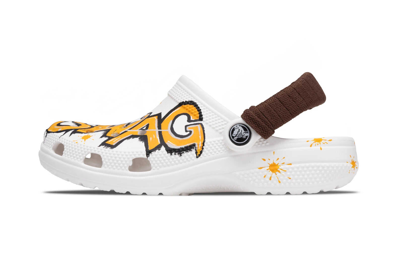 该定制鞋选用Crocs卡骆驰 Classic clog EVA 经典沙滩 洞洞鞋 2cm 男女同款,货号10001-100。鞋面上的泼墨和点状图案带有浓厚的街头艺术风格,类似于街头涂鸦艺术。这种设计将街头潮流文化融入到洞洞鞋中,使原本较为休闲日常的洞洞鞋增添了潮流感和艺术氛围,符合当下年轻人对街头时尚的追求,能够轻松融入到街头穿搭风格中。洞洞鞋本身以舒适轻便著称,适合日常休闲穿着。在保证舒适的基础上,通过定制化的涂鸦图案设计,为鞋子赋予了时尚属性,使得穿着者在享受舒适的同时,也能紧跟时尚潮流,实现了舒适与时尚的结合,拓宽了洞洞鞋的穿搭场景和受众群体 。