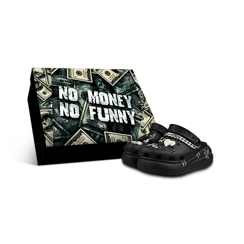 该定制版鞋选用原鞋款为Crocs卡骆驰 Classic Lined款,货号为207521-001黑色。灵感来源于十字元素是哥特风的灵魂符号,手绘其上,为鞋履注入神秘与不羁,仿佛在宣告对传统的叛逆。链条的加入,增添硬朗质感,碰撞出冷酷气场,每一次晃动都似奏响暗黑乐章。爱心挂饰则如暗黑中的柔光,以柔化刚,打破单调,让酷中带甜。